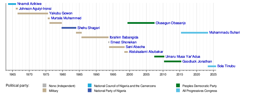 This article tells you about the leaders of Nigeria, from when it became independent in 1960 until today. The leader of a country is often called the "head of state." In Nigeria, the President is currently both the head of state and the head of government.
