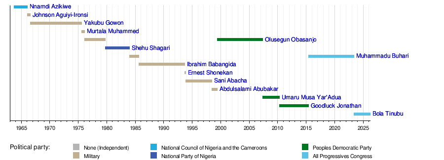 This timeline shows when each head of state served in Nigeria.