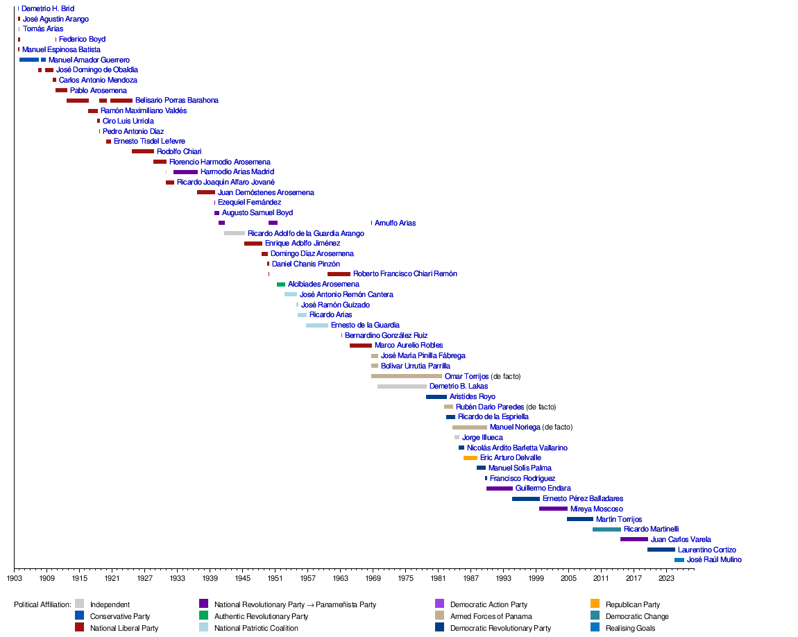 This timeline shows when each president or leader was in power. It helps you see the order of leadership in Panama's history.