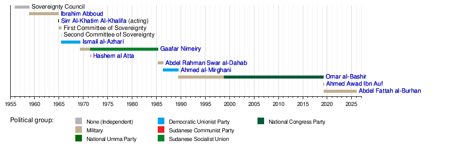 Before 1956, Sudan was ruled by both Egypt and the United Kingdom. This shared rule was like a partnership. When Sudan became independent, a group of five people, called the Sovereignty Council, took charge. This was because different groups couldn't agree on one single leader.