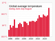 2023's June–July–August season was the warmest on record globally by a large margin, as El Niño conditions continued to develop.