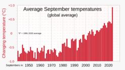 September 2023 was the warmest September on record globally, with an average surface air temperature 0.5 °C above the temperature of the previous warmest September (2020).
