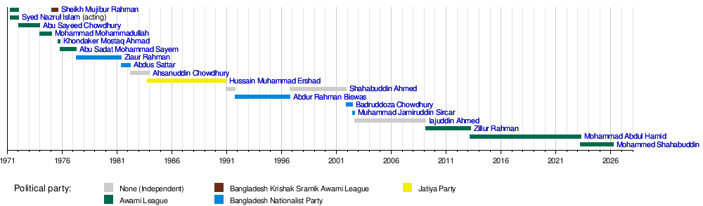 Here is a list of the people who have served as president of Bangladesh. You'll see which political party they belonged to and how long they were in office.