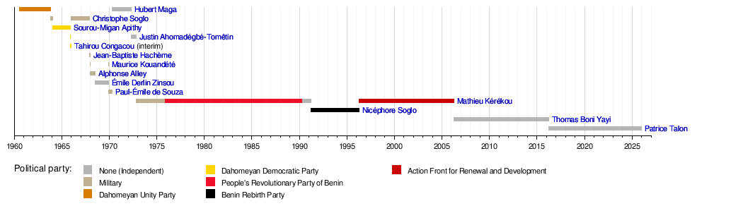 This table shows the presidents and leaders of Benin, from its independence to today.