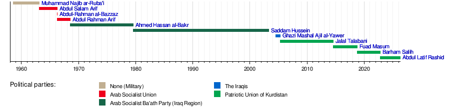 Here is a list of the leaders of Iraq since the country became a republic in 1958. These leaders are called presidents.