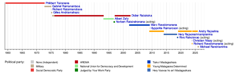 This is a list of presidents of Madagascar, since the establishment of the office of President in 1959, during the Malagasy Republic. The president is the head of state and the Commander-in-Chief of the armed forces. The position has been held by Michael Randrianirina as President of the Council of the Presidency for the Re-Foundation of the Republic of Madagascar since 17 October 2025.