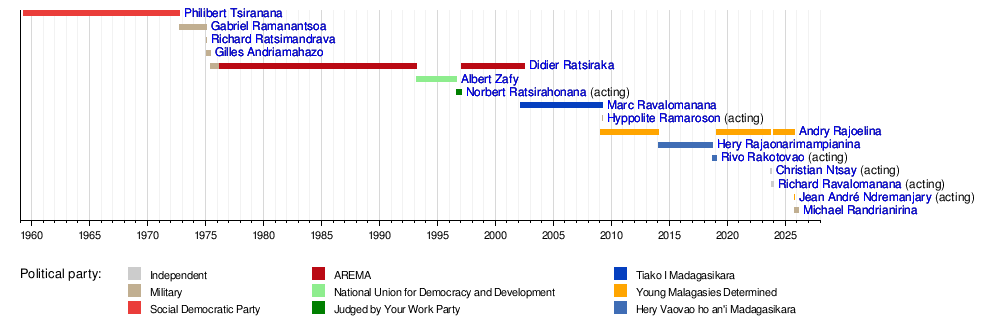 This section shows a list of all the people who have served as President of Madagascar. It also includes their political parties and when they were in office.