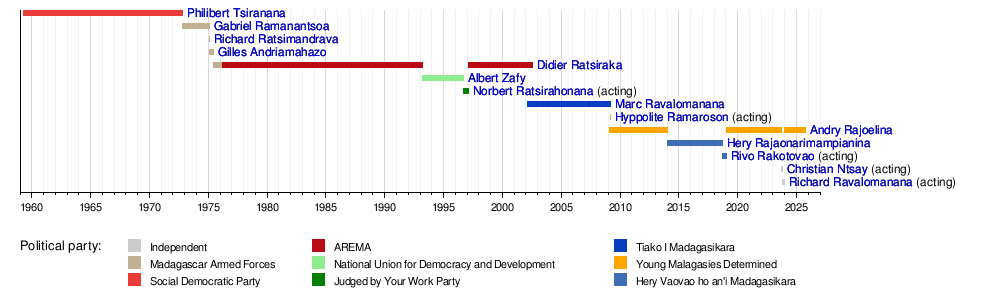 Here is a list of all the presidents of Madagascar. You can see their pictures, when they were in office, and which political party they belonged to.