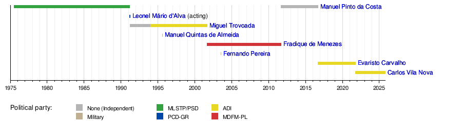 Here is a list of all the people who have served as President of São Tomé and Príncipe. You can see their names, when they were in office, and which political party they belonged to.