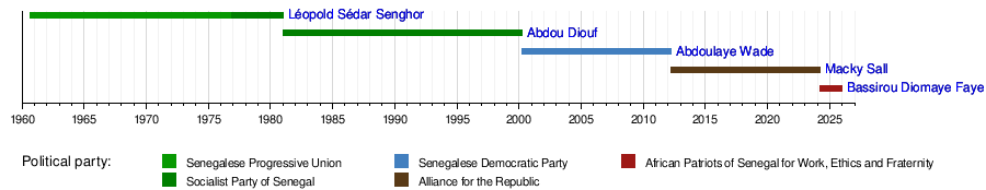 Since a special vote (called a referendum) in 2016, the president serves for five years. They can only be elected two times in a row. Senegal became independent from France in 1960. Since then, several leaders have held this important role.