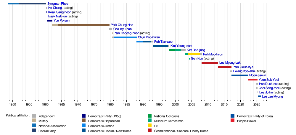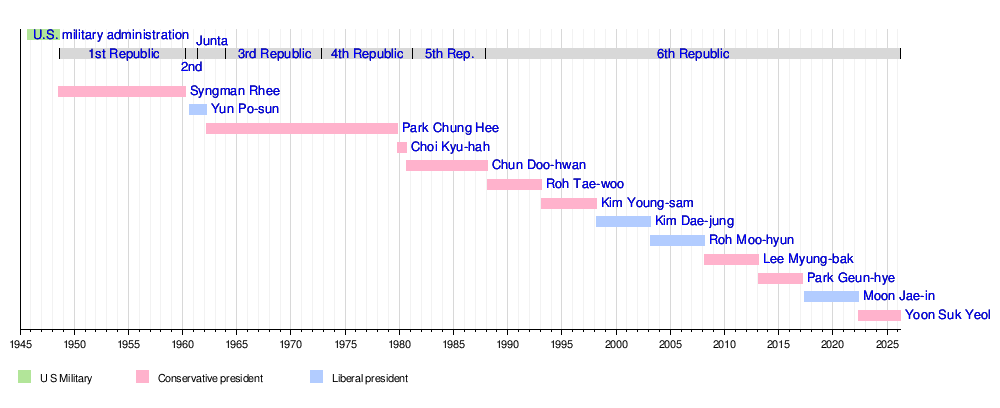 | Conservative | 9 | 21765 days | Choi Kyu-hah, Chun Doo-hwan, Kim Young-sam, Lee Myung-bak, Park Chung Hee, Park Geun-hye, Roh Tae-woo, Syngman Rhee, and Yoon Suk Yeol | |