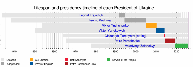 Most presidents of Ukraine, except for Volodymyr Zelenskyy, were already members of the Ukrainian parliament (called the Verkhovna Rada) before they became president. Some, like Leonid Kuchma, Viktor Yushchenko, and Viktor Yanukovych, had even served as Prime Minister before. Leonid Kravchuk was the first president to leave office early. Later, in 2014, after some big changes in Ukraine, Viktor Yanukovych left his position. The head of the parliament, Oleksandr Turchynov, became the acting president for a short time. New elections were held on May 25, 2014, and Petro Poroshenko became the fifth president. He started his term on June 7, 2014. The sixth and current president is Volodymyr Zelenskyy, who won the election in 2019 and began his term on May 20, 2019.