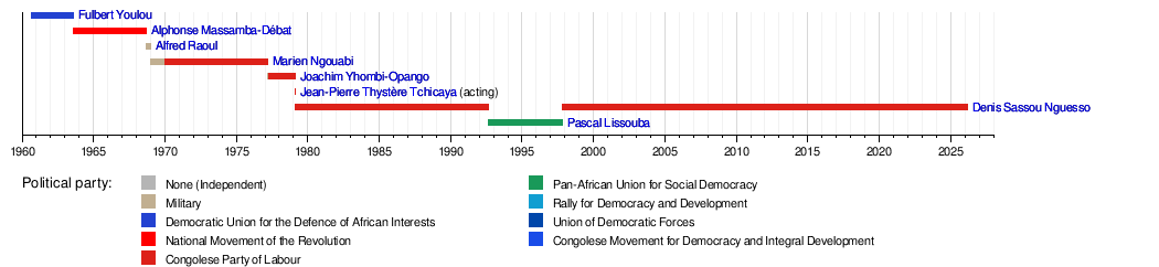 This section shows the different people who have been President of the Republic of the Congo. It also shows their political parties and when they were in office.