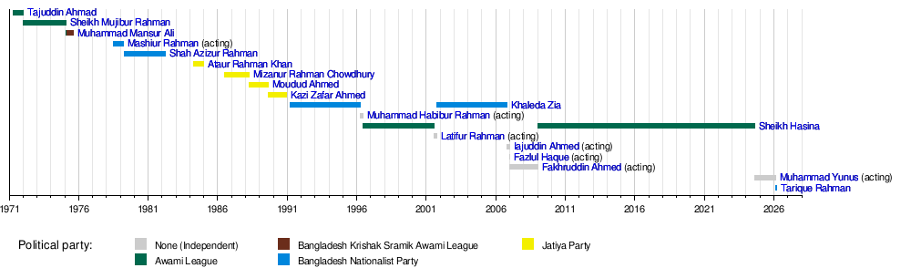 This timeline shows when each leader served as Prime Minister or Chief Adviser.