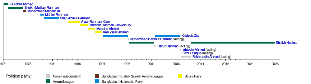 This timeline shows you how long each Prime Minister served and which party they belonged to. It's a great way to see the history of leadership in Bangladesh at a glance!
