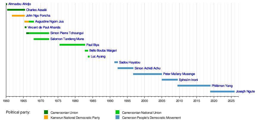 This page lists every person who has served as Prime Minister of Cameroon since the country gained independence from France in 1960.