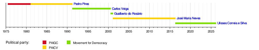 This section lists all the people who have been Prime Minister of Cape Verde. It shows when they started and ended their time in office. It also shows which political party they belonged to.