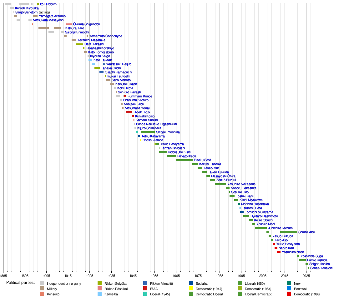 This timeline shows when each Prime Minister served and which political party they belonged to. It helps to see the history of leadership in Japan at a glance.