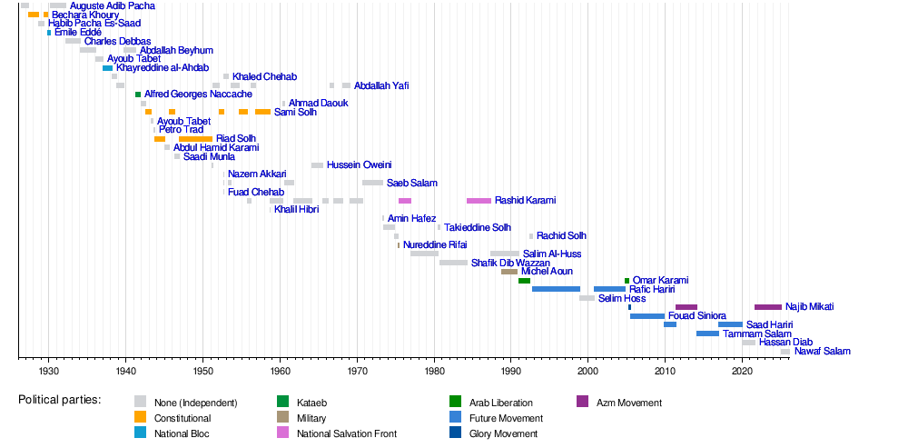 This section lists all the Prime Ministers of Lebanon. They are grouped by the different periods of Lebanon's history.
