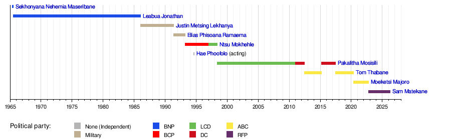 This timeline shows when each Prime Minister served in Lesotho. It helps you see how long each person was in office and which political party they belonged to.