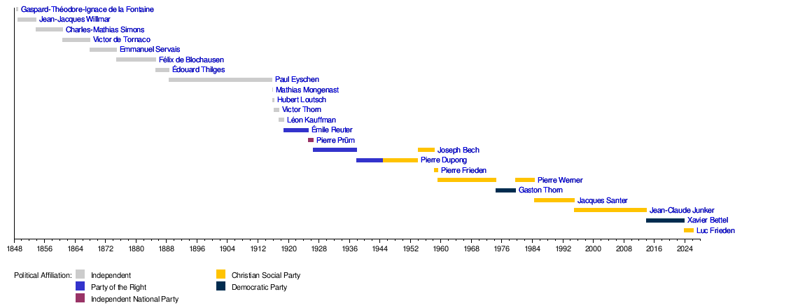 This article lists the Prime Ministers and their governments since the role began in 1848. The larger dates show when a Prime Minister started and left office. Smaller dates show changes within a Prime Minister's government. Luxembourg has a system where the government works together. Sometimes, a government might resign, but many of the same ministers stay with the same Prime Minister.