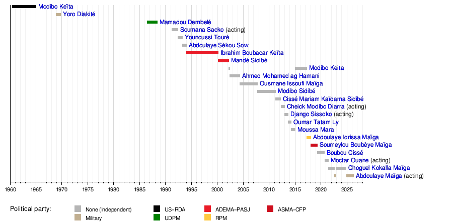 So far, seventeen different people have served as Prime Minister of Mali. This count does not include five people who served as "acting" prime ministers for a short time. One person, Modibo Keita, even held the job two separate times! The current Interim Prime Minister of Mali is Abdoulaye Maïga. He has been in this role since November 21, 2024. He was chosen by the National Committee for the Salvation of the People, which has been leading the country since a change in government in 2021.