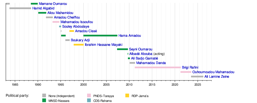 Here is a list of all the people who have served as Prime Minister of Niger. You can see when they started and when they left office.