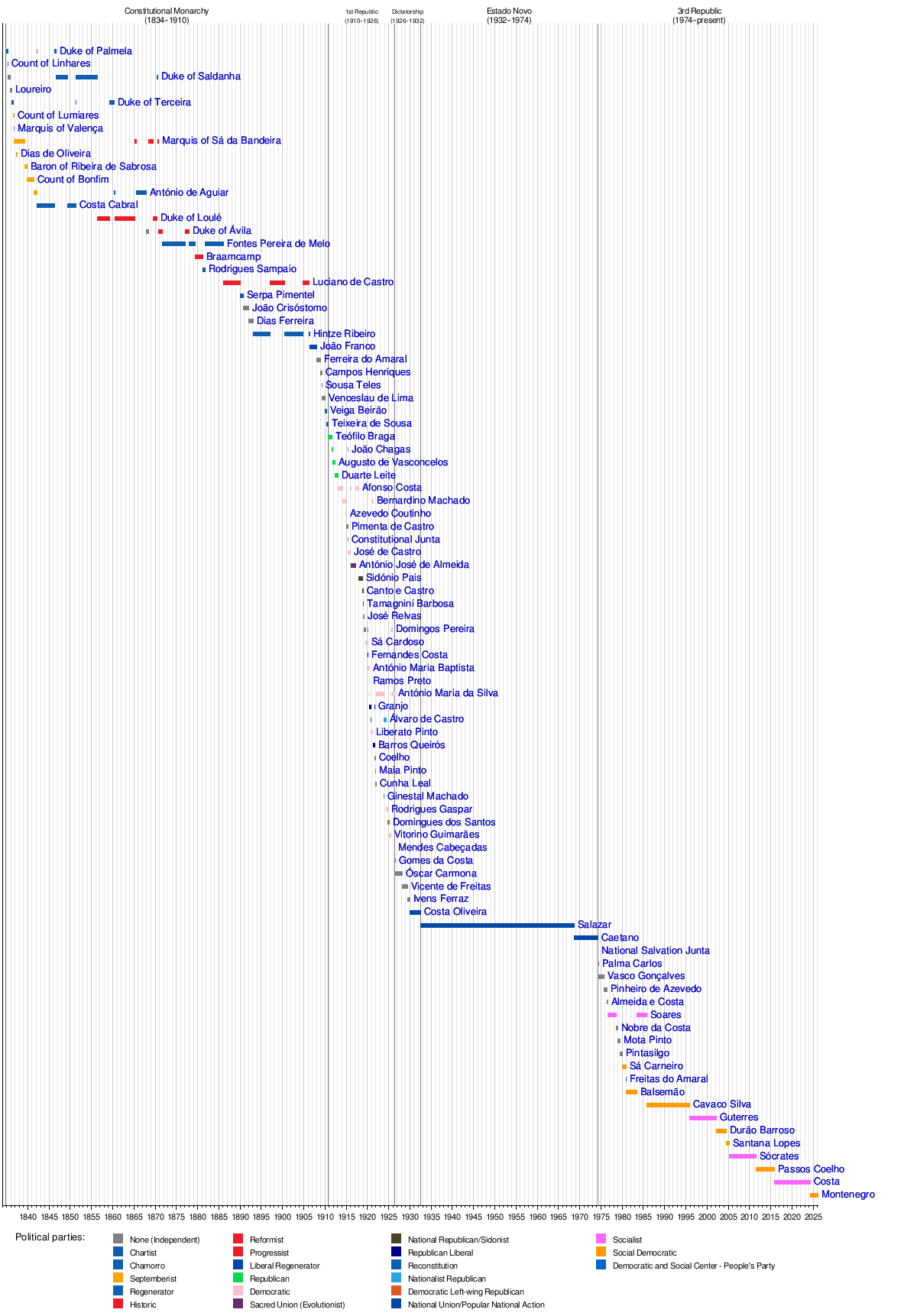 | He was the first Prime Minister from the second largest party to form a government. His party made an agreement with other left-wing parties. Portugal faced wildfires in 2017. The COVID-19 pandemic caused a recession. Portugal held the Presidency of the Council of the European Union in 2021. He resigned after a corruption investigation. | |||||||