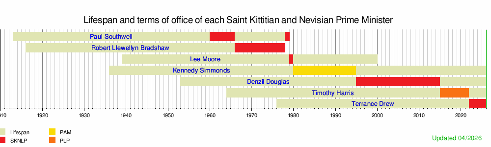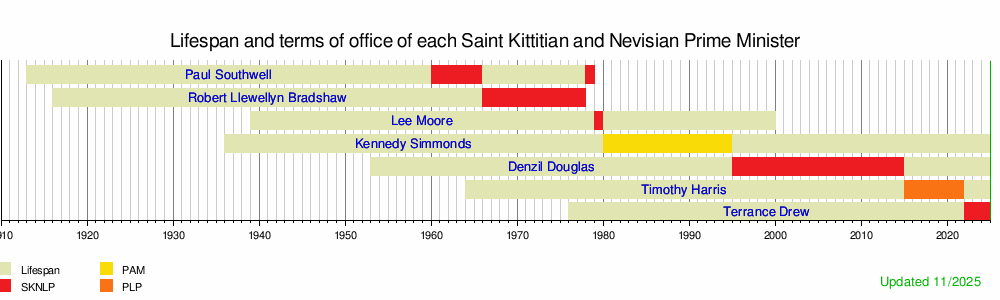 This timeline shows how long each Prime Minister of Saint Kitts and Nevis has lived and served in office. It helps us see their time as leaders.