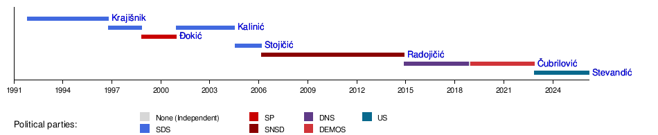 The National Assembly of Republika Srpska was formed in 1991. Since then, several people have held the important role of Speaker. This list shows who they were. It also shows how long they served. You can see which political party they belonged to.