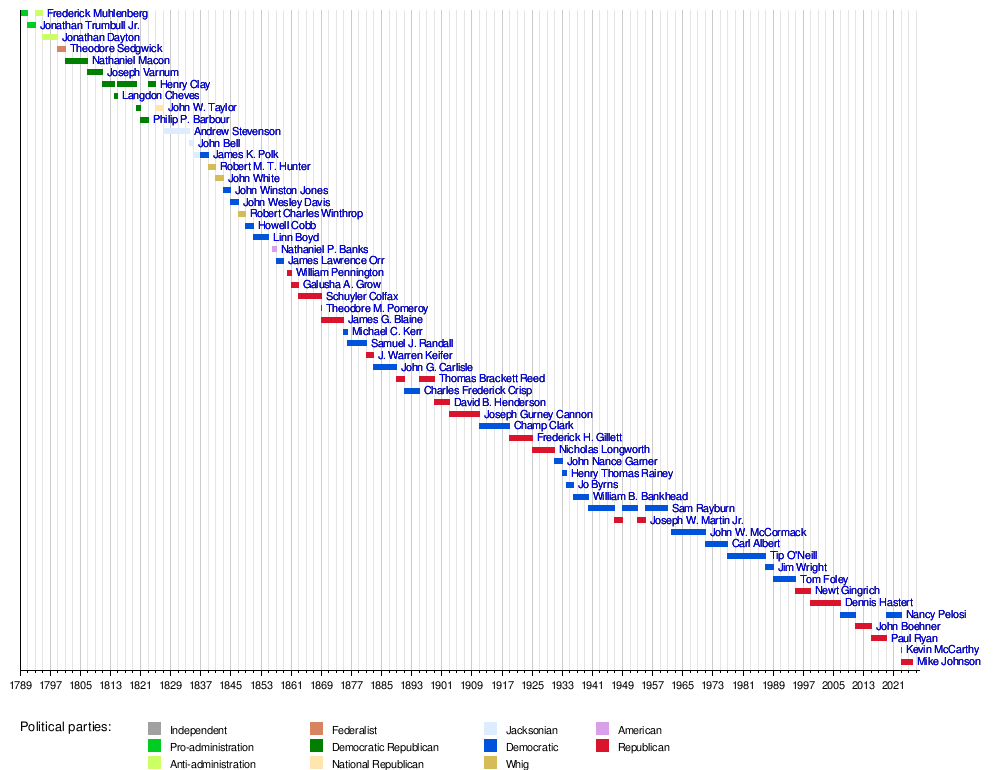 Out of the 56 people who have been Speaker, 32 served more than one term. Seven of them served terms that were not in a row. These include Frederick Muhlenberg, Henry Clay, John W. Taylor, Thomas Brackett Reed, Joseph W. Martin Jr., Sam Rayburn, and Nancy Pelosi. In total, a new Speaker has taken office 65 times. Every Speaker has belonged to a political party. Here's how many belonged to each party: