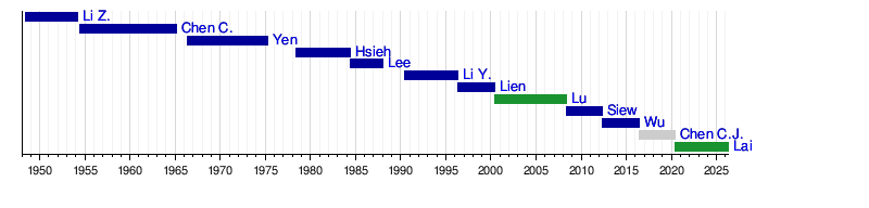 This timeline shows who has been the Vice President of the Republic of China since 1948. You can see how long each person served. Different colors show the political party each Vice President belonged to.