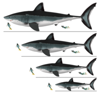 Estimates for Megalodon's maximum length vary, from about 14.2 to 24.3 meters (46 to 80 feet). For comparison, a large great white shark is usually around 6 meters (20 feet) long. The largest living fish, the whale shark, can reach about 18.8 meters (62 feet). Most Megalodons, from young to adult, were probably around 10.5 meters (34 feet) long.