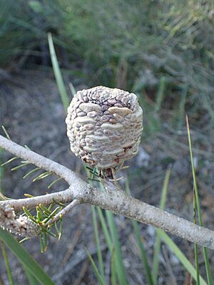 This type of banksia does not have a special underground stem called a lignotuber. This means that when a bushfire burns through its habitat, the plant usually dies. However, the fire is important for its survival! When the plant is killed by fire, its furry seed pods open up. This releases the seeds, allowing new plants to grow and the species to continue.