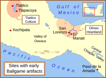 Another possible origin is the Olmec heartland near the Gulf Coast of Mexico. The Aztecs called the people from this area Olmeca, meaning "rubber people." This is because the region was famous for making latex (rubber). The oldest known rubber balls in the world were found at El Manatí, an early Olmec site. These balls are from around 1700–1600 BC. They were found with other special items, showing the game had religious meaning even then.
