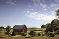 A pastoral farm scene near Traverse City, Michigan, with a classic American red barn