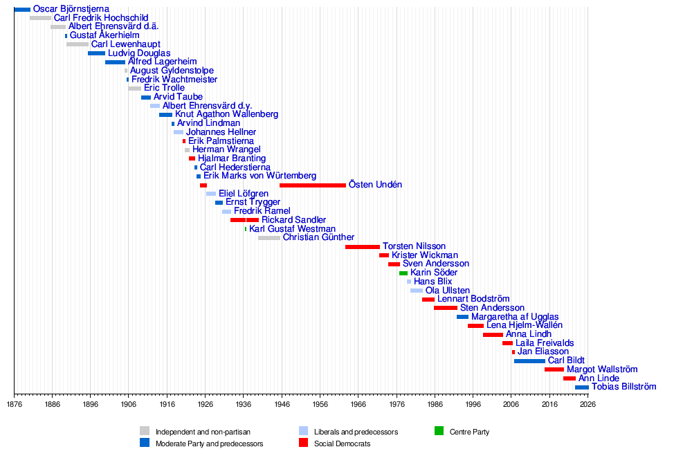 18 October 2022 | Incumbent | 3 years, 104 days | Moderate Party | Kristersson | ||