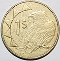 The back of the 1-mark and 1-dollar coins showed Namibia's old coat of arms. It was surrounded by the word "NAMIBIA," the year (1990), and two ears of corn. The 10-mark and 10-dollar coins had "INDEPENDENCE" and "UNABHÄNGIGKEIT" (German for "independence") instead of the ears of corn.