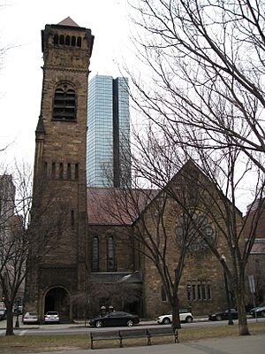 The Central Congregational Church at 67 Newbury Street in Back Bay became a National Historic Landmark on October 16, 2012. This church is special because it has the largest complete interior designed by Louis Comfort Tiffany still in its original place in America. It's now called the Church of the Covenant.
