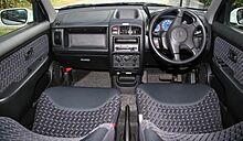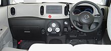 The car still seated five people. Nissan designers said the inside felt like a cozy "jacuzzi." This was to make the car feel comfortable and social. You could see a "water-ripple" pattern on the ceiling. This pattern was also on the speaker covers and cup holders. Nissan offered many accessories to let owners make their Cube unique. These included colorful decorations for air vents and window switches. There were also special hooks, elastic bands, and LED lights for the footwell.