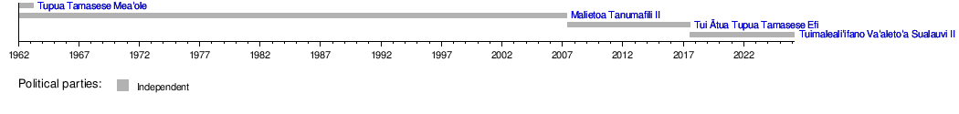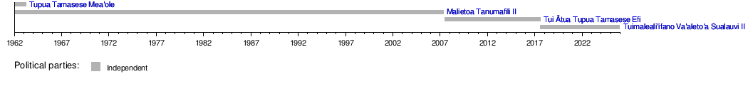1 January 1962 | 11 May 2007 | 45 years, 130 days | Independent | Mulinuʻu II Lealofi IV Tupua Kolone Alesana Tuilaʻepa |