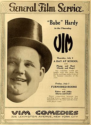 The next year, he made his first movie, Outwitting Dad (1914). He was billed as O. N. Hardy. In his personal life, people called him "Babe" Hardy. He was billed as "Babe Hardy" in many later films. Hardy was a big man, standing 6 feet 1 inch tall and weighing up to 300 pounds. His size often led him to play villains. But he also starred in funny short films. By 1915, Hardy had made 50 short films.