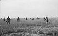 Men of the 2nd Battalion, Royal Warwickshire Regiment, of the 185th Brigade of the 3rd Infantry Division, advancing through a wheat field during the final assault on Caen.