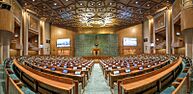 Above the speaker's seat in both chambers, you can see a sculpture of the Ashoka Chakra, an ancient symbol of India. A special 1.5-meter-long scepter, called the Sengol, is placed next to the speaker's seat in the Lok Sabha. This beautiful silver and gold-plated staff has an image of a Nandi (a sacred bull) and represents fair governance.