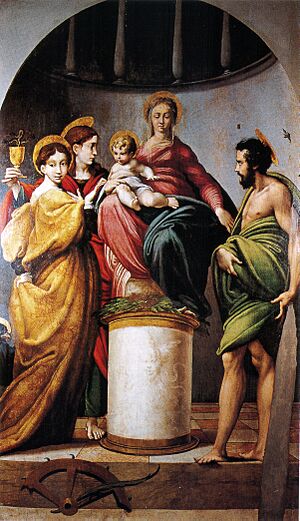 People in Rome were very impressed with Parmigianino's work. Some even said he was like Raphael reborn. In 1526, Parmigianino and his uncle agreed to decorate the church of San Salvatore in Lauro. They planned to paint an altarpiece called the Vision of Saint Jerome. However, a year later, the Sack of Rome happened. This war event forced Parmigianino and many other artists to leave the city.