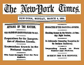 Lincoln's inauguration took place on March 4, 1861, at the United States Capitol. In his speech, he tried to calm the South. He said he had no power to interfere with slavery in states where it already existed. He also promised to enforce laws about runaway enslaved people. Lincoln assured the states that had left the Union that the government would not attack them.