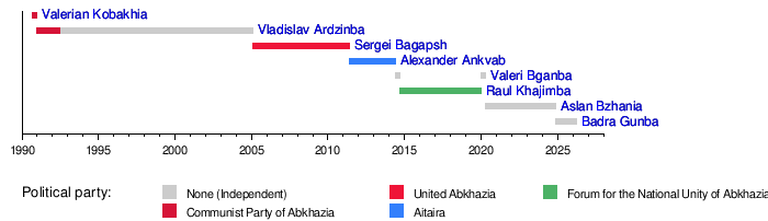 This important job was created in 1994. Before that, the leader of Abkhazia was called the Chairman of Parliament from 1992 to 1994. Even earlier, the highest position was the Chairman of the Supreme Soviet. This position existed from August 25, 1990, when Abkhazia declared it was sovereign (self-governing) from the Georgian Soviet Socialist Republic, until July 23, 1992, when it declared full independence.