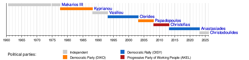 | 8 | Nikos Christodoulides | 6 December 1973 | 49 years, 85 days | 2 years, 324 days (Ongoing) | Incumbent | Living | 52 years, 43 days (Living) |
