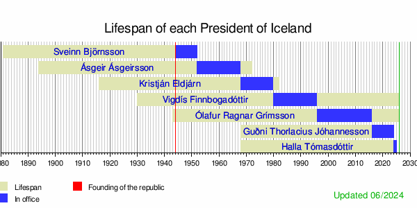 | He was the Regent of Iceland from 1941 to 1944 before becoming the first president. He was the only president to die in office. When he passed away, the powers of the presidency were temporarily held by the prime minister, the president of Parliament, and the president of the Supreme Court. | |||||||