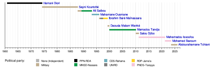 Here is a list of all the people who have been the head of state in Niger. It shows when they served and what political group they belonged to.
